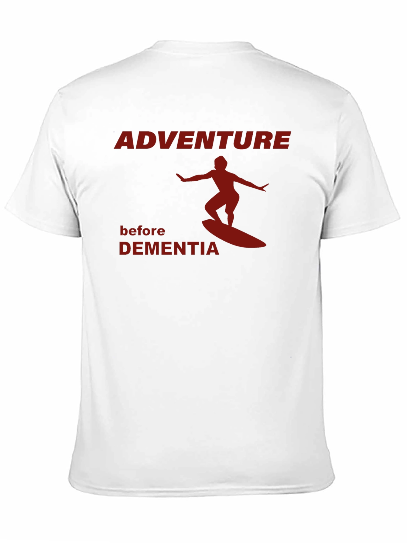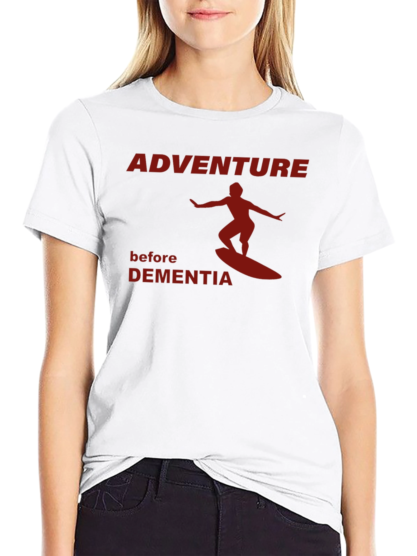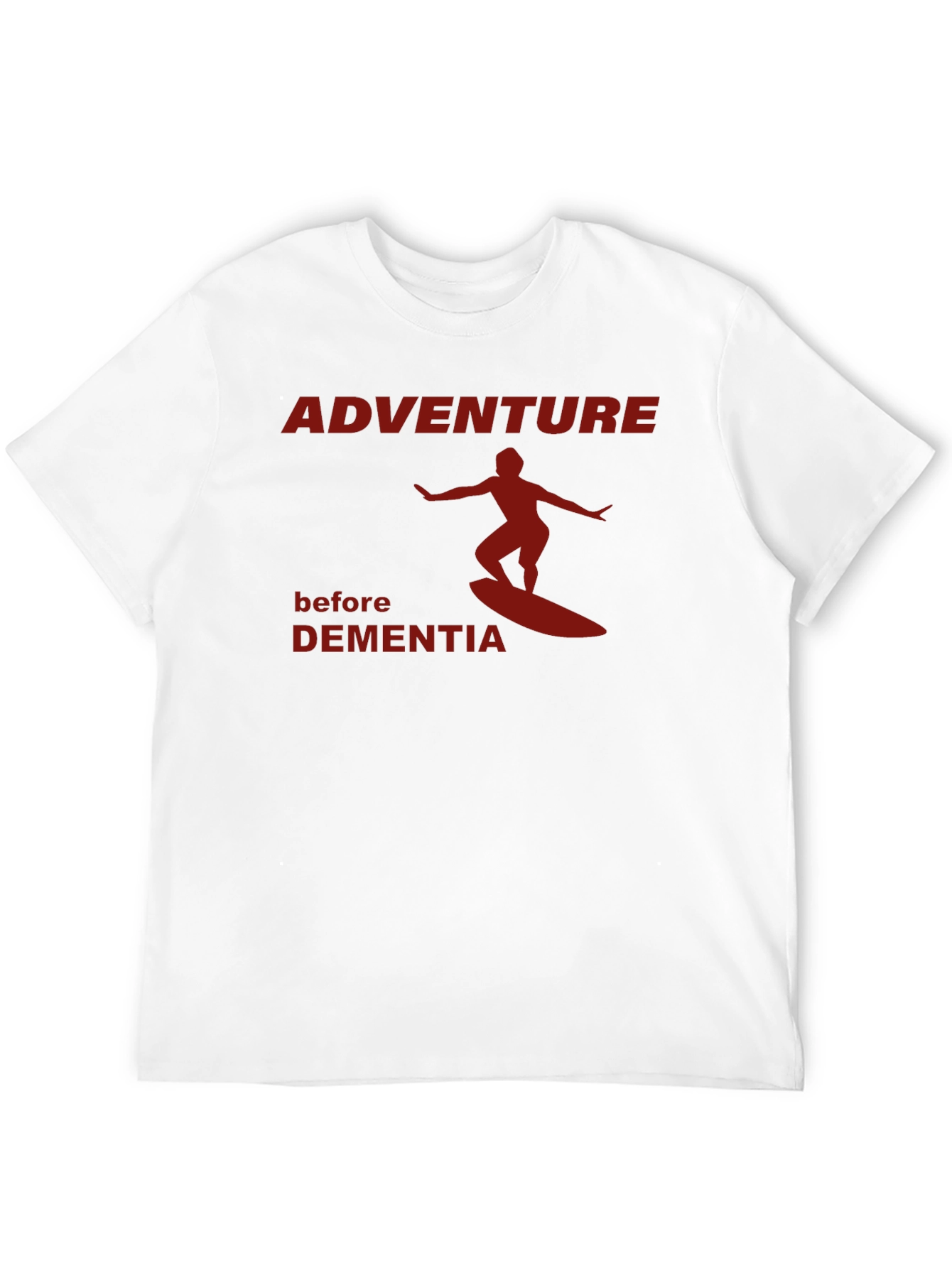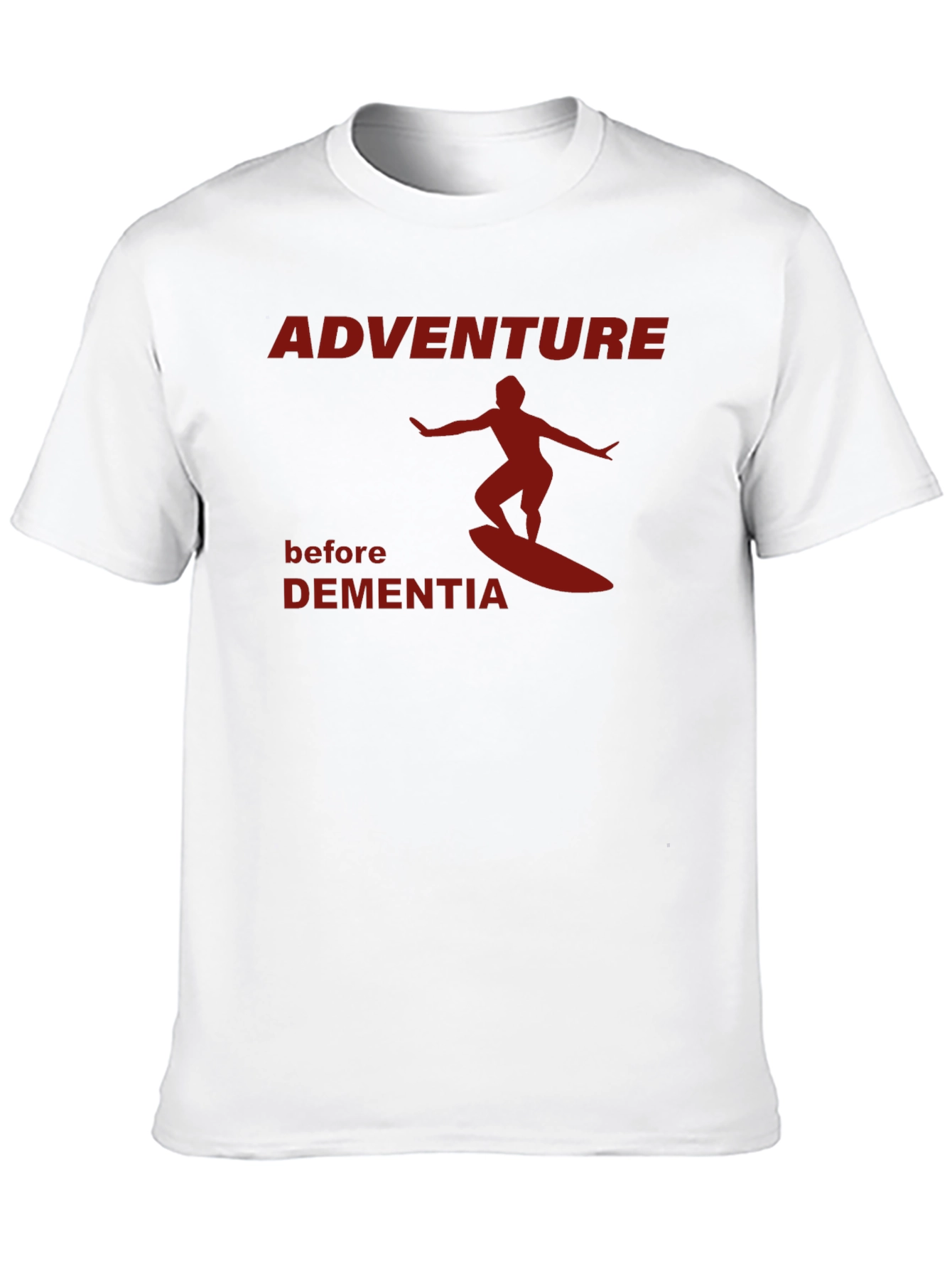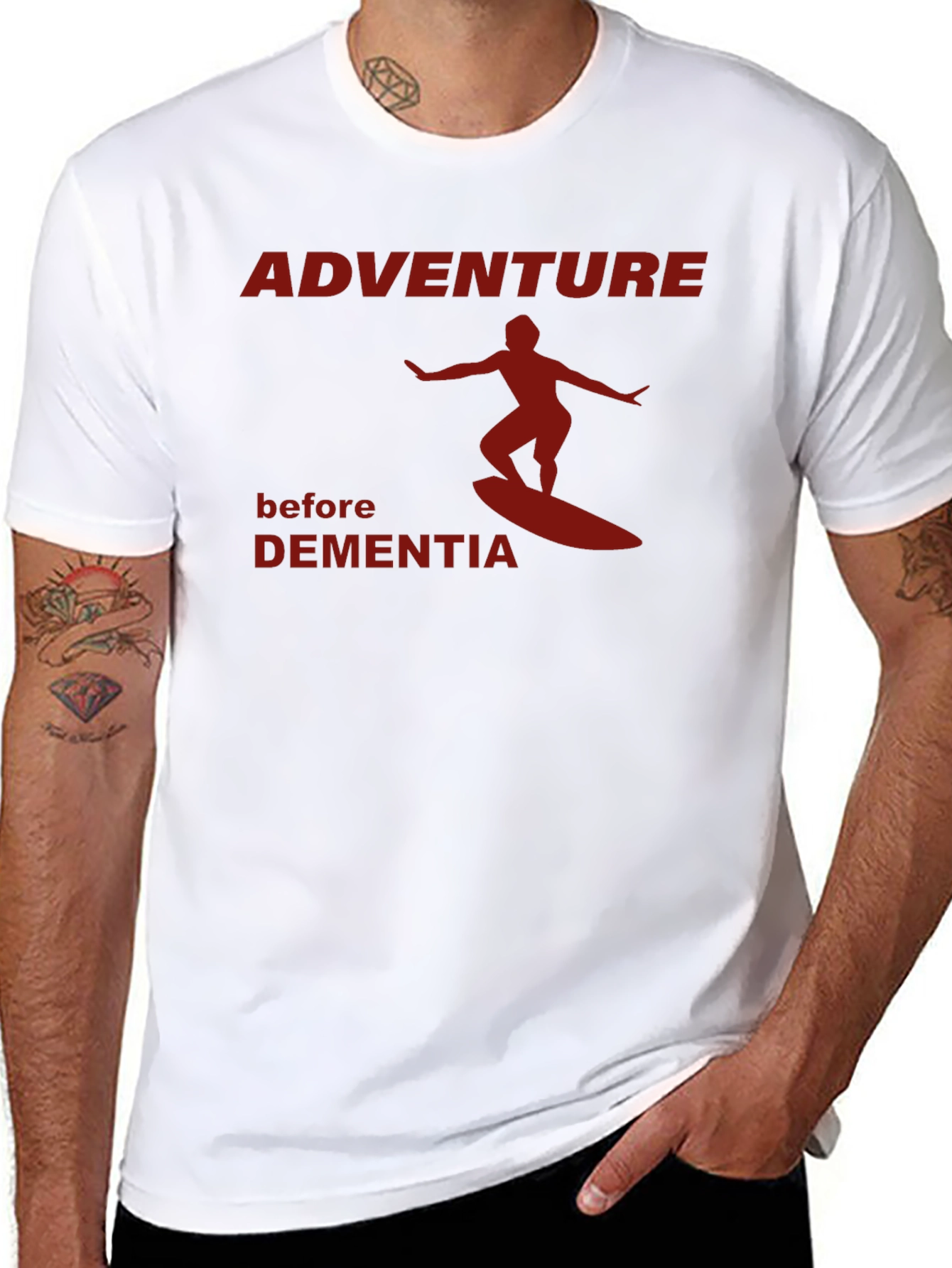 Embrace the spirit of adventure with this eye-catching graphic t-shirt. The design features bold, red lettering that reads "ADVENTURE" above an image of a surfer. Below that, in smaller letters, it says "before DEMENTIA." The shirt is made from a comfortable, soft fabric, perfect for everyday wear. The classic fit and crew neck make it a versatile addition to any wardrobe. Whether you're hitting the waves or simply embracing life to the fullest, this t-shirt is a great way to express your passion for adventure. Make a statement and inspire others to live life to the max with this unique tee.