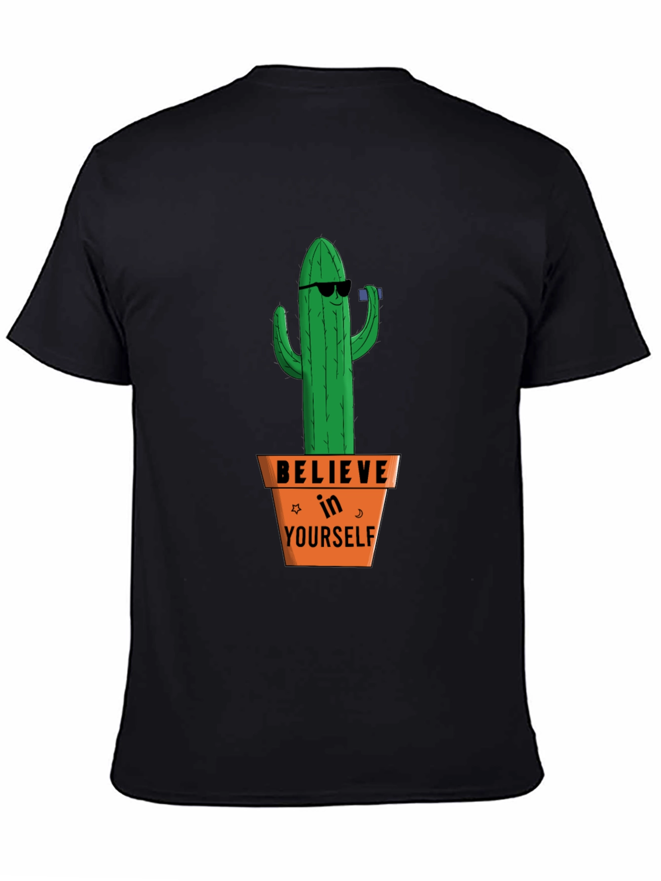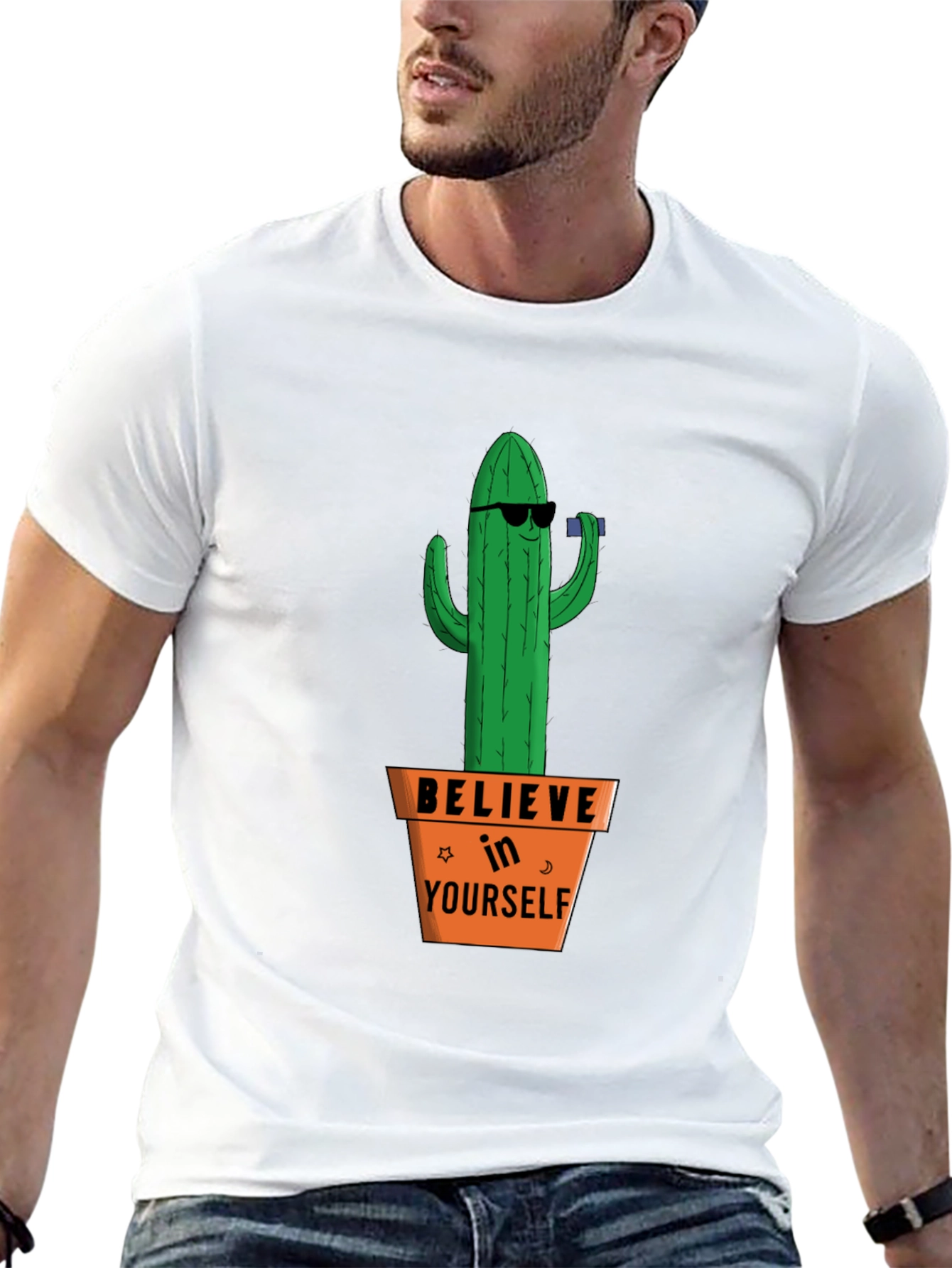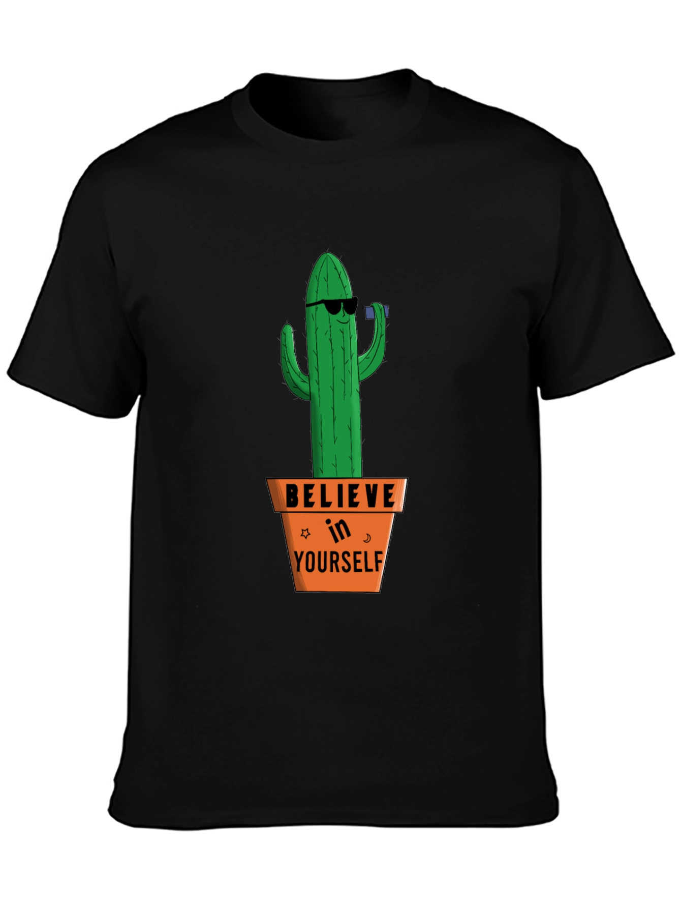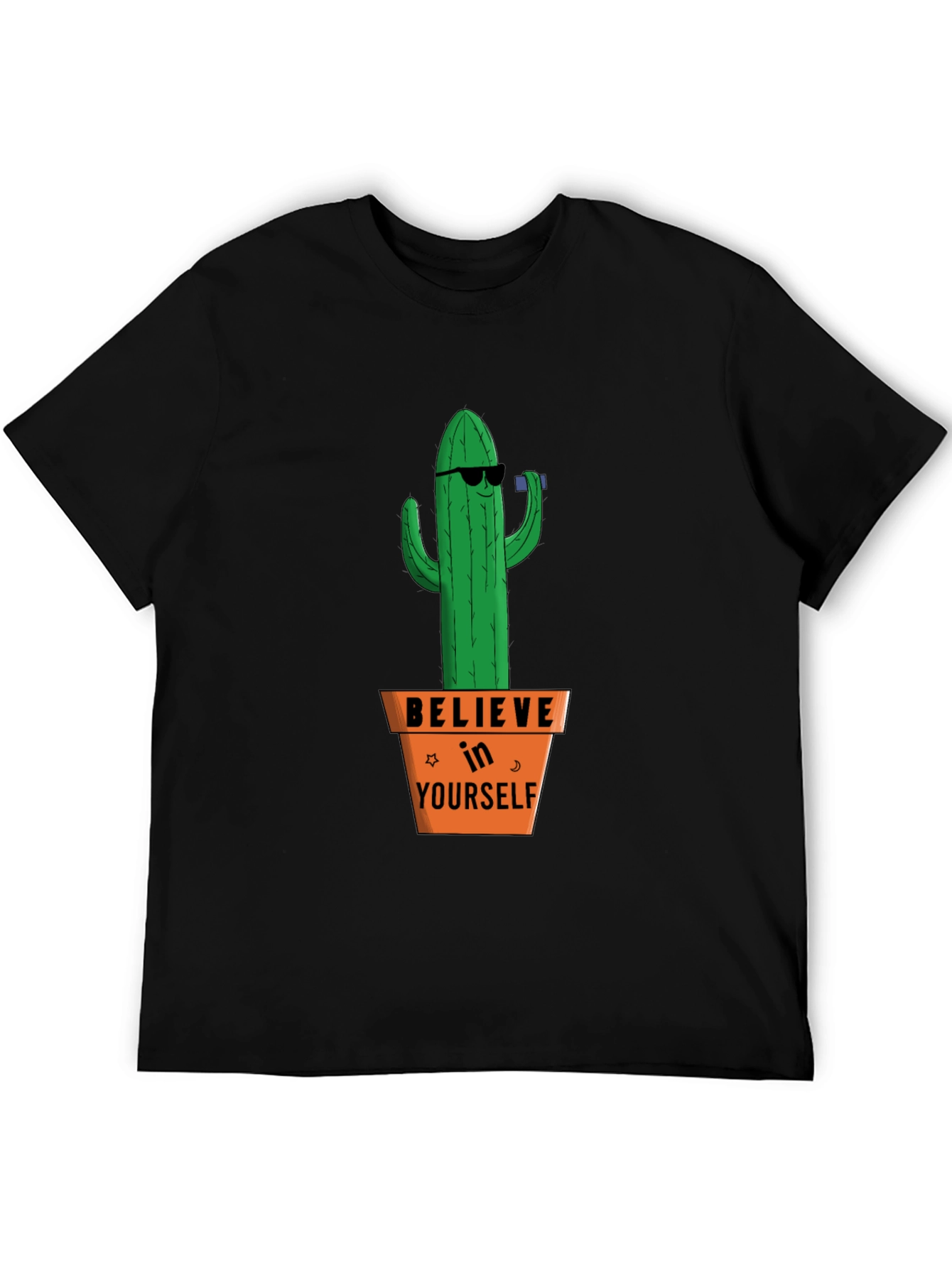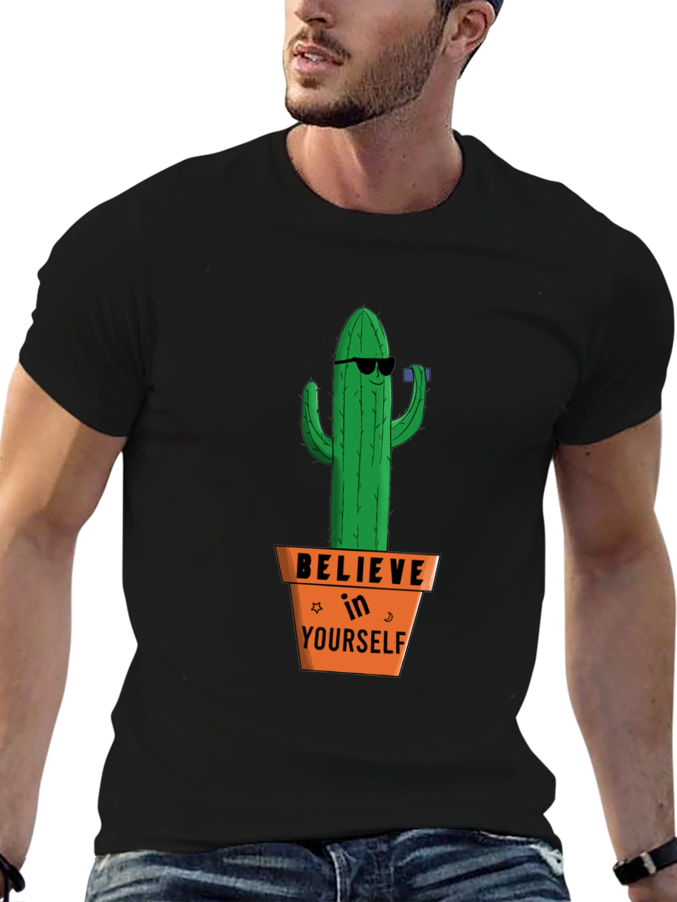 Show off your positive vibes with this unique t-shirt. This black tee features a cartoon cactus wearing sunglasses and lifting weights, potted in a planter with the words 'Believe in Yourself'. The design is playful and motivational, perfect for adding a touch of humor and encouragement to your wardrobe. Made from a soft, comfortable fabric, this t-shirt is ideal for everyday wear. Whether you're hitting the gym, hanging out with friends, or just relaxing at home, this shirt is sure to bring a smile to your face and inspire those around you.