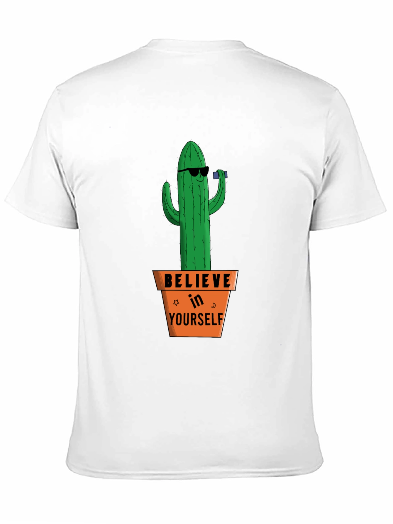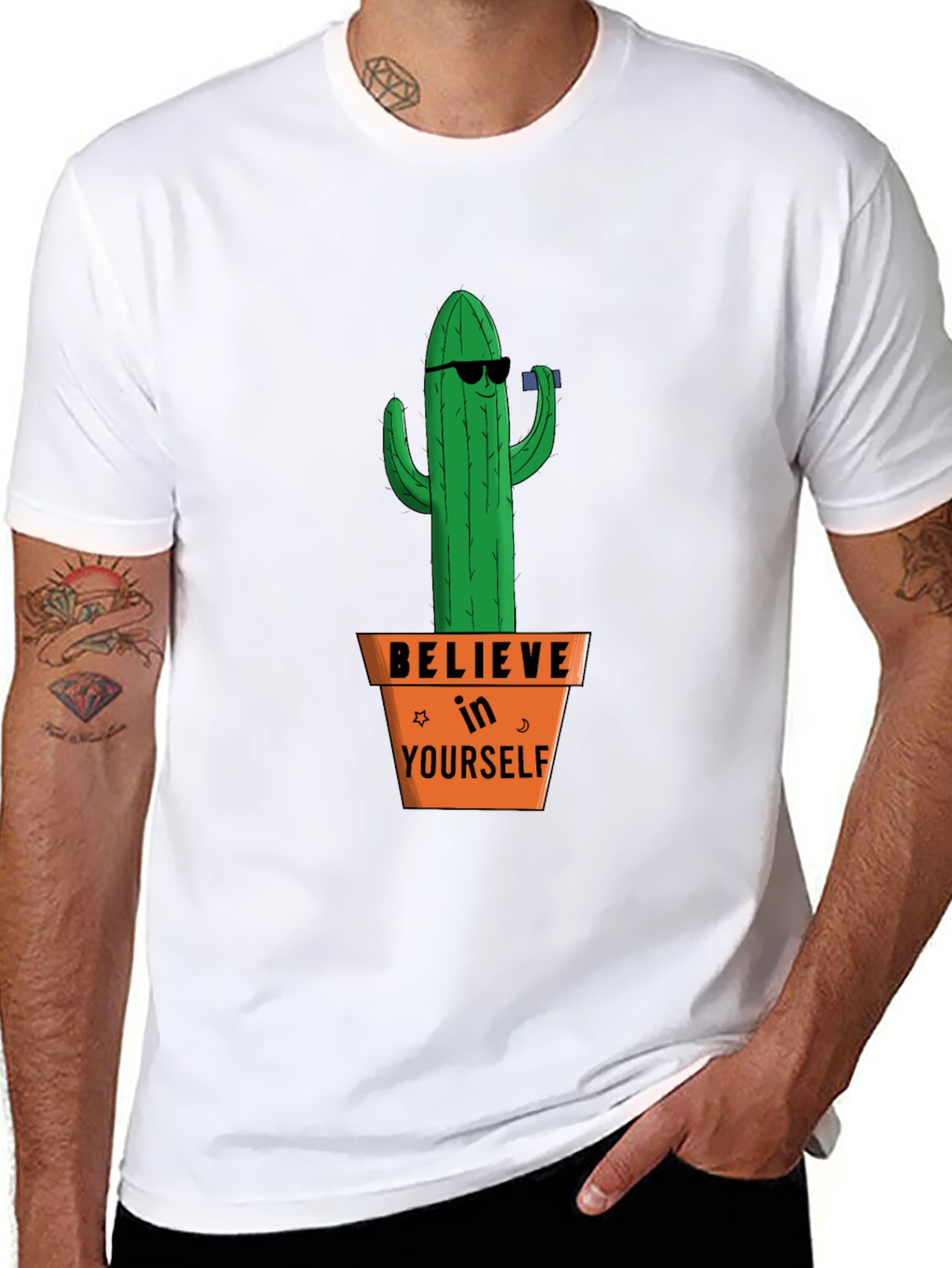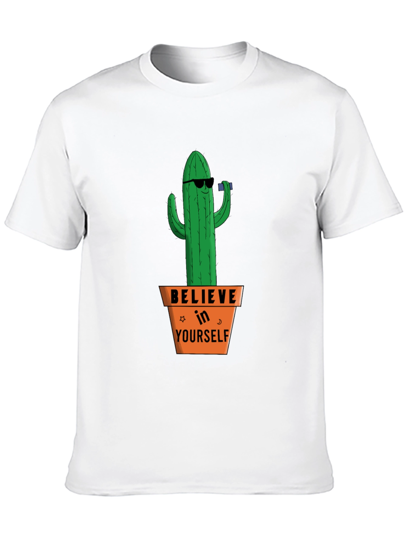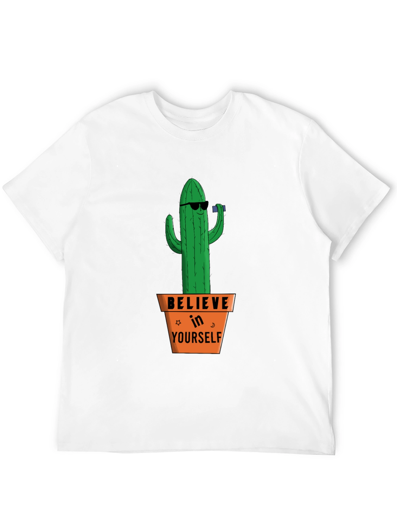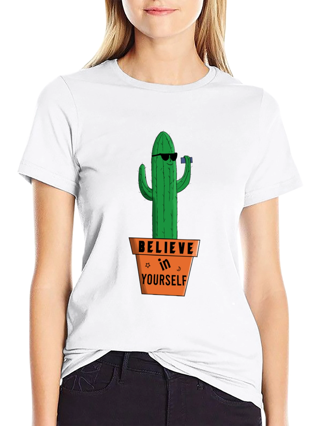 Show off your positive vibes with this unique t-shirt. This black tee features a cartoon cactus wearing sunglasses and lifting weights, potted in a planter with the words 'Believe in Yourself'. The design is playful and motivational, perfect for adding a touch of humor and encouragement to your wardrobe. Made from a soft, comfortable fabric, this t-shirt is ideal for everyday wear. Whether you're hitting the gym, hanging out with friends, or just relaxing at home, this shirt is sure to bring a smile to your face and inspire those around you.