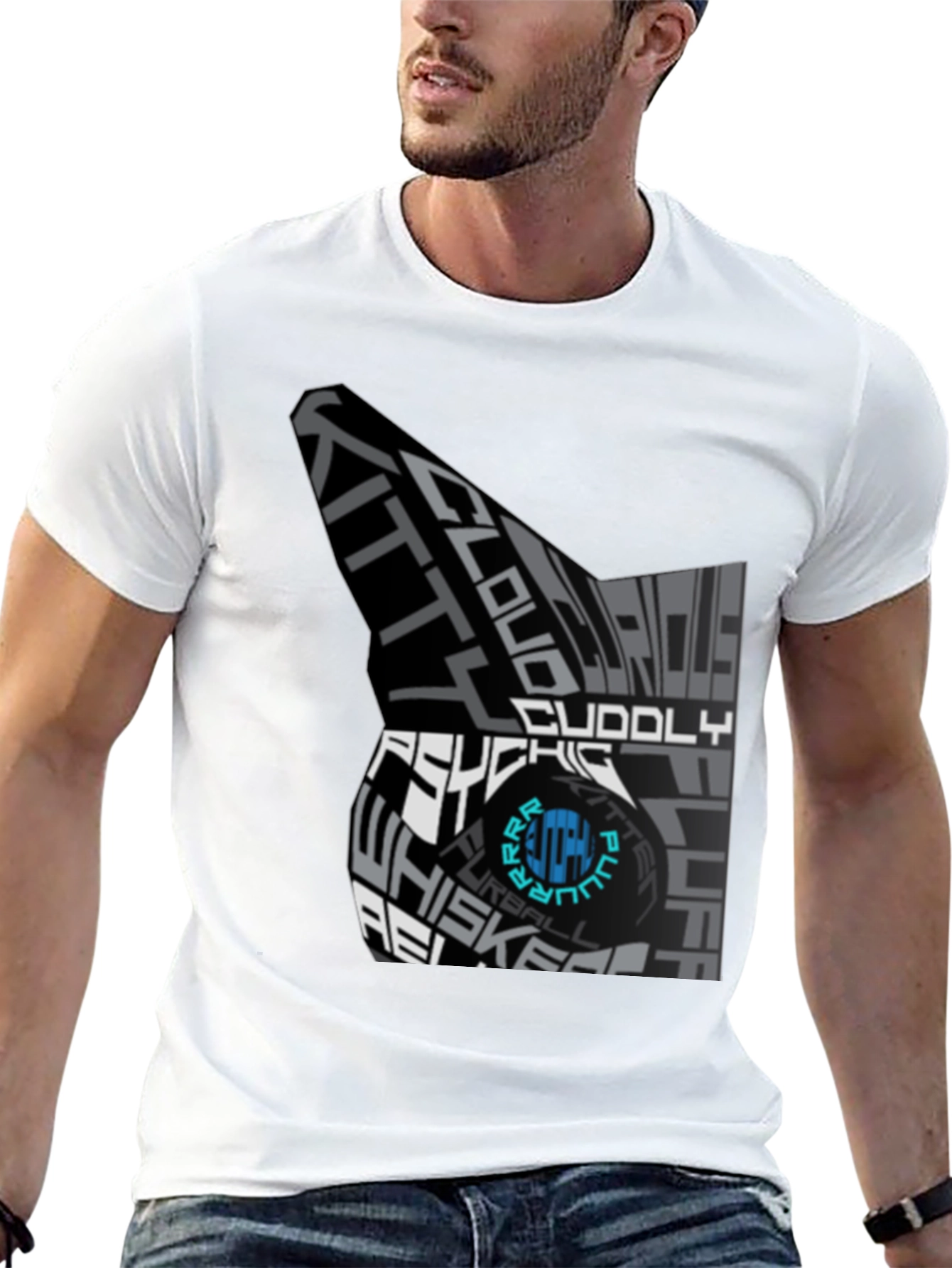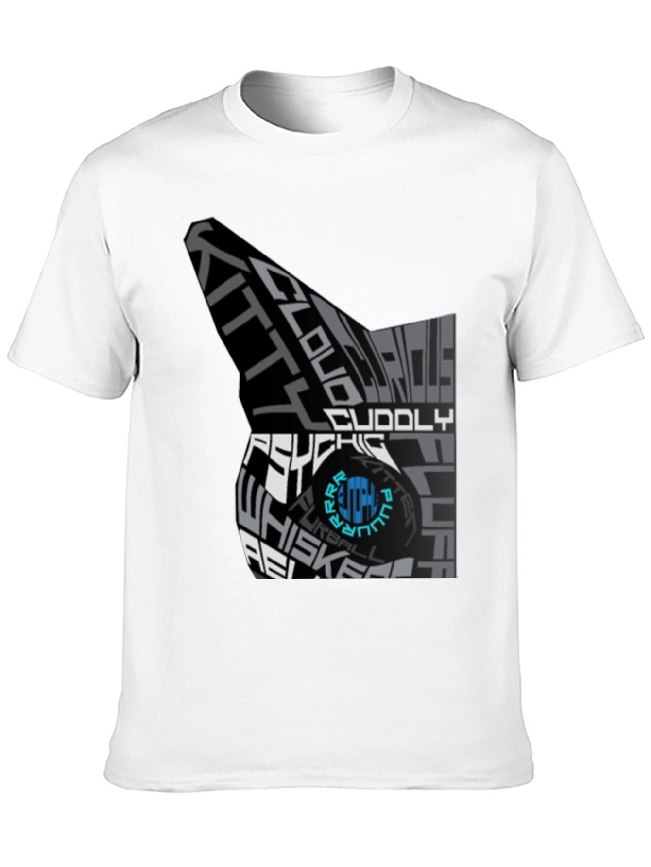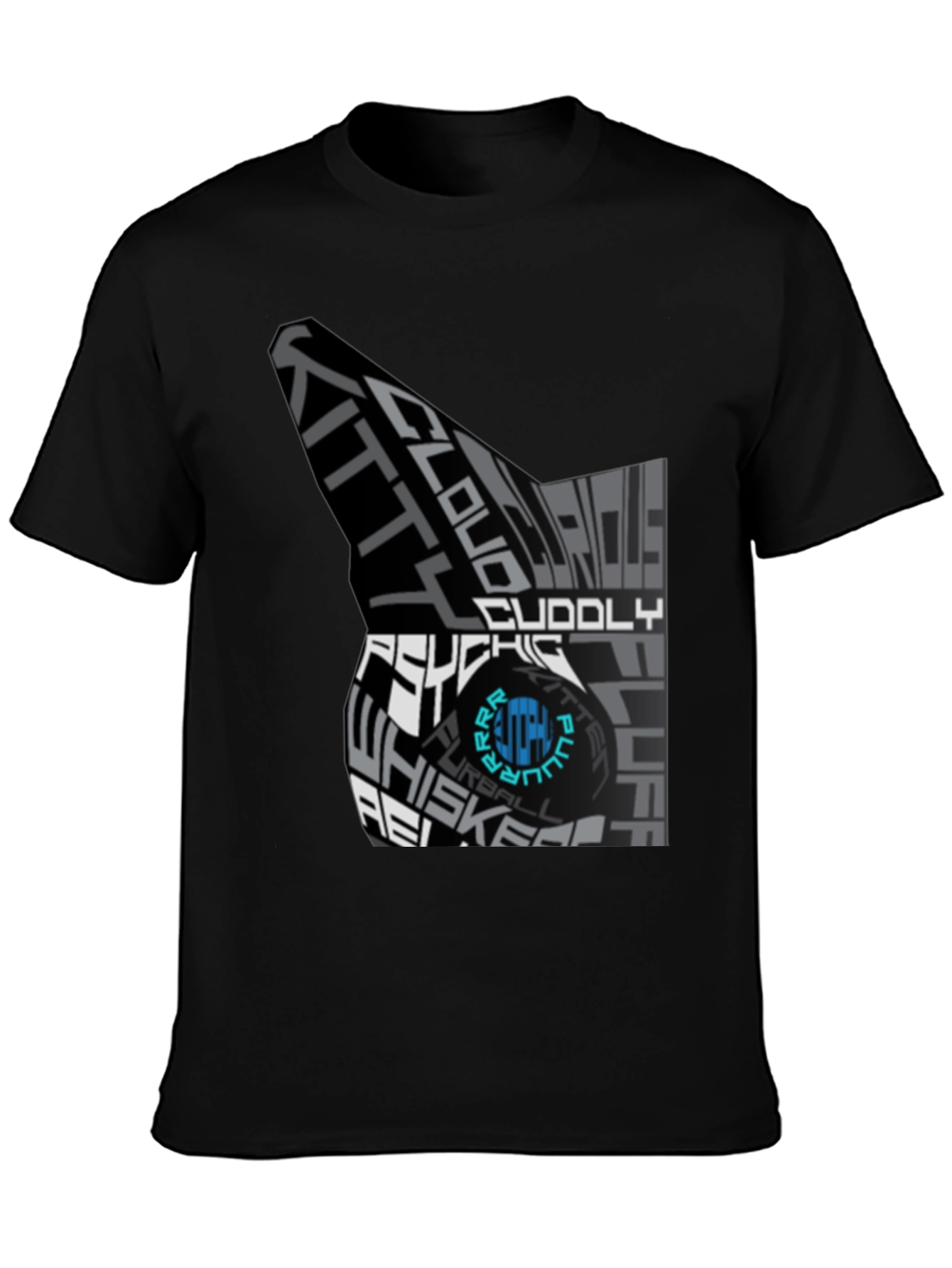 Show off your love for cats with this unique black t-shirt. The design features a silhouetted cat face creatively filled with typography related to feline characteristics and behaviors. Words like "Kitty", "Cuddly", "Whiskers", and "Purrball" are artfully arranged to form the cat's face. The shirt appears to be made of a comfortable, breathable fabric, perfect for casual wear. Ideal for cat lovers, this t-shirt is a fun and stylish way to express your passion for your furry friends. Wear it while lounging at home or as a statement piece on your next outing.