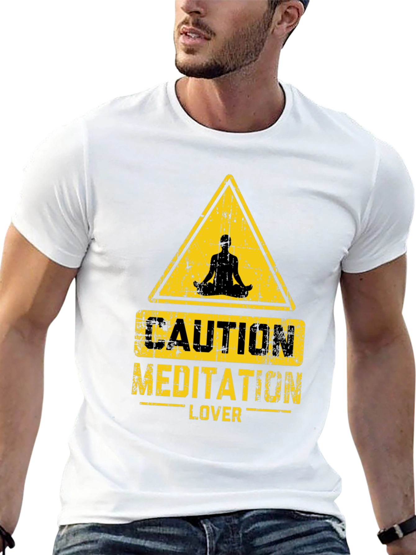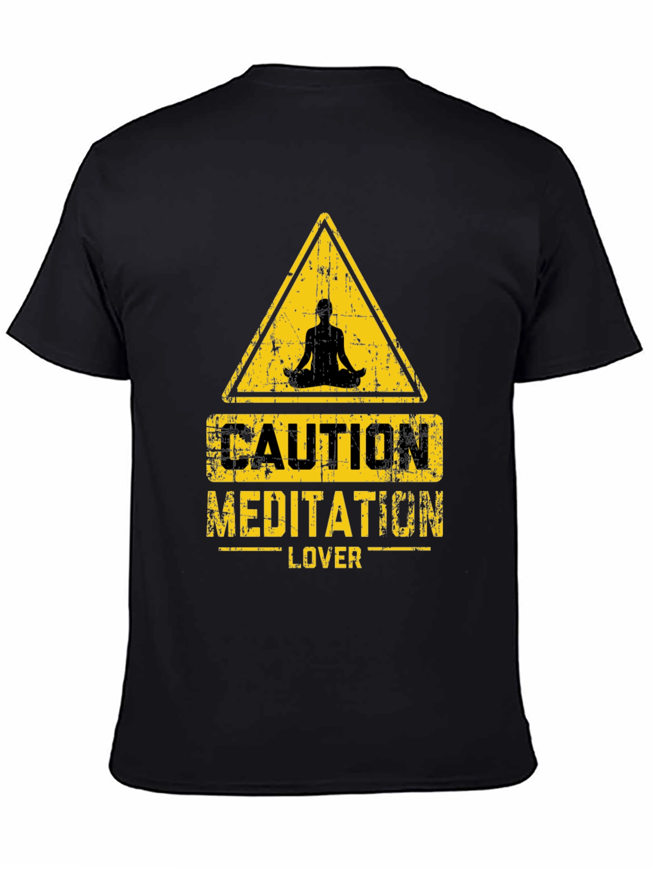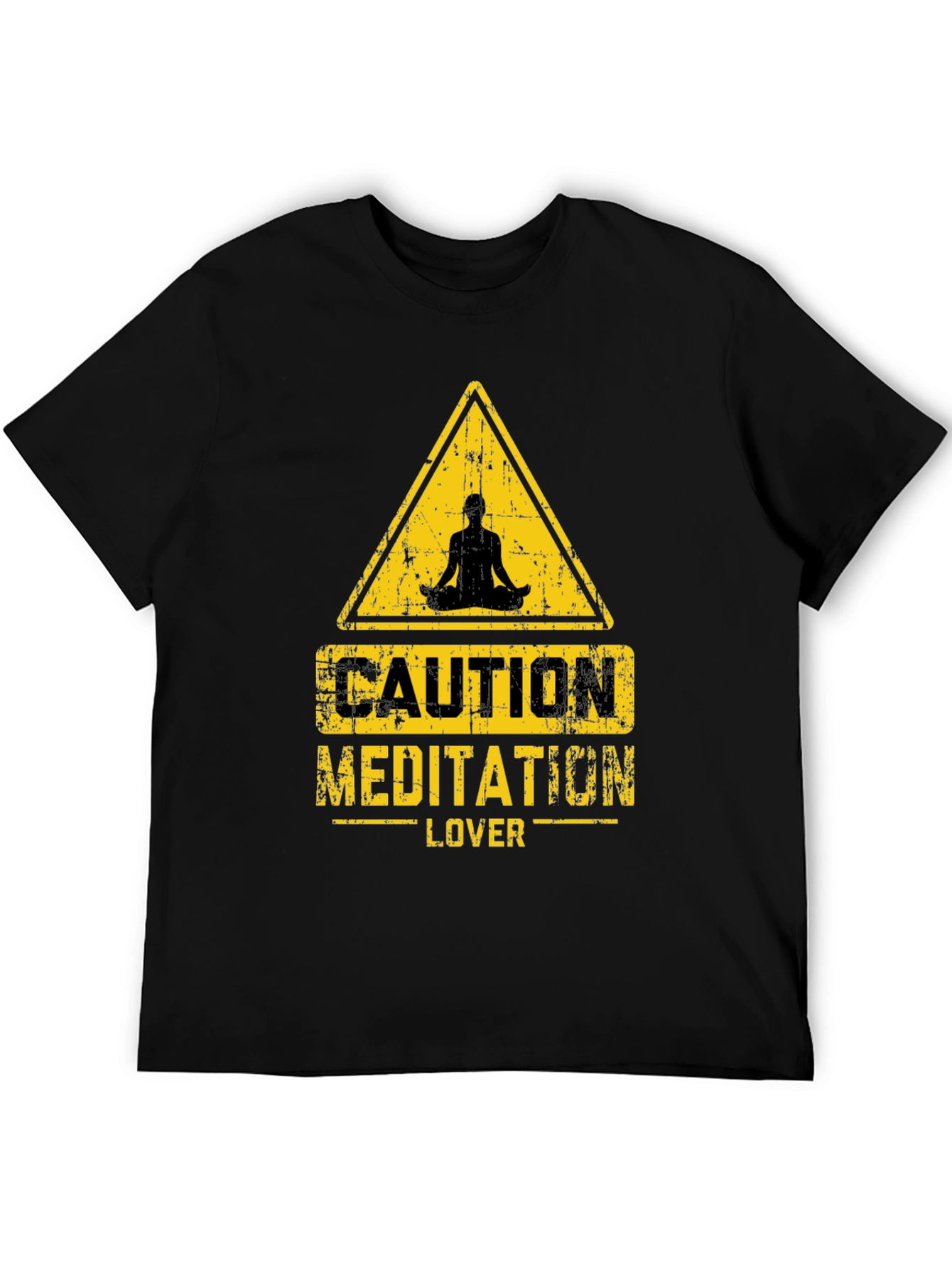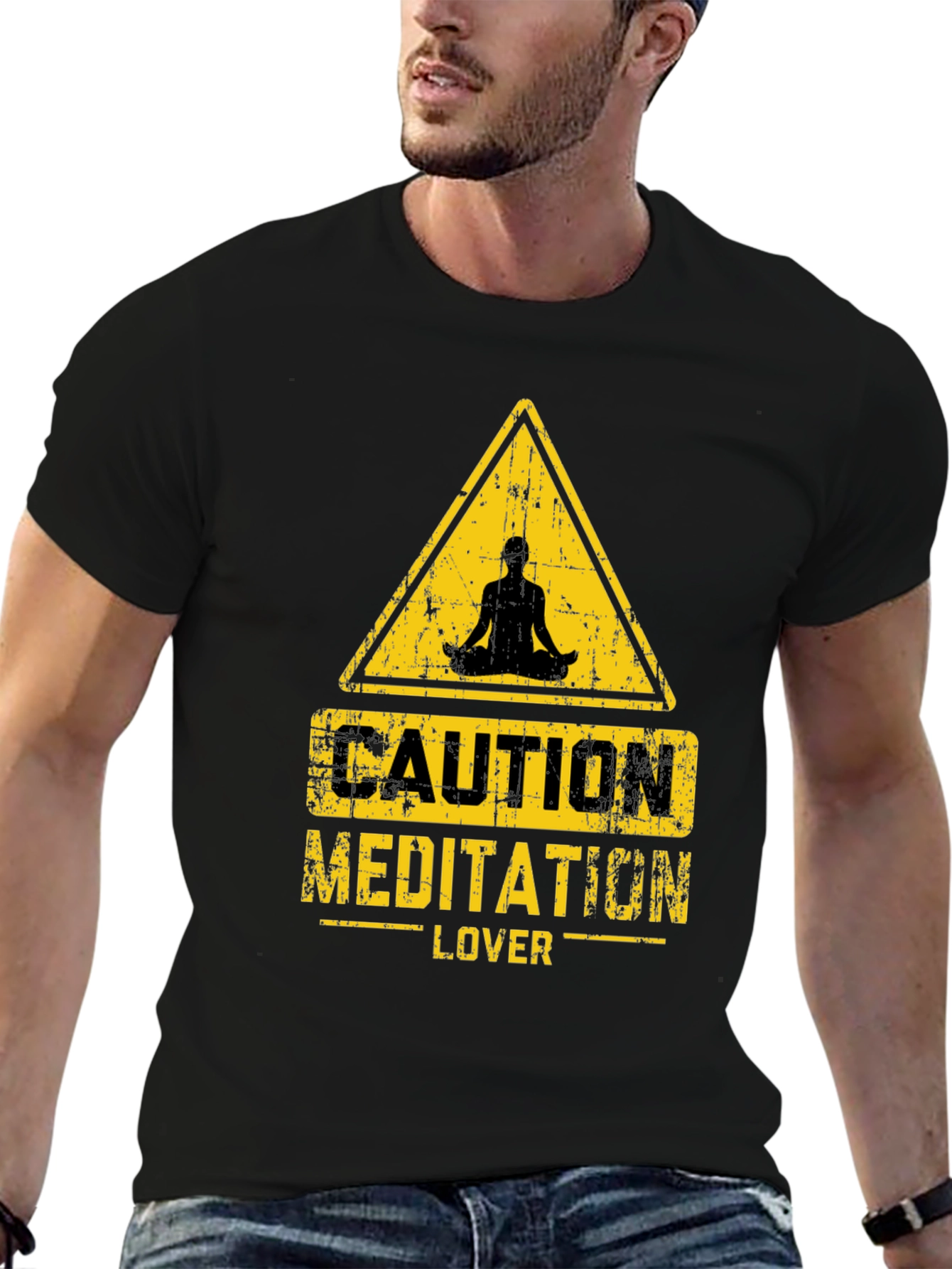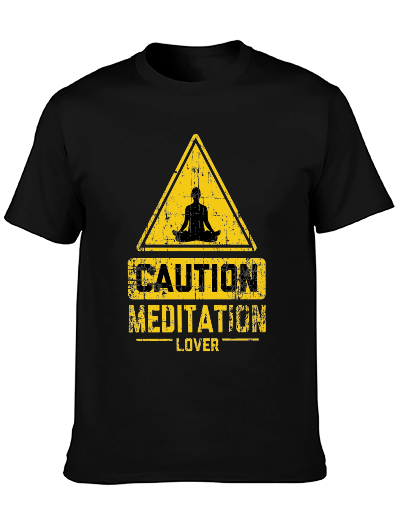 This eye-catching black t-shirt features a unique "Caution Meditation Lover" graphic design. A yellow caution sign showcases a meditating figure, drawing attention to the wearer's passion for mindfulness. The distressed text adds a vintage, edgy touch. Made from a soft, breathable fabric, this shirt is perfect for casual wear, yoga sessions, or simply expressing your love for meditation. It's an ideal conversation starter and a great gift for meditation enthusiasts. Show off your inner peace with this stylish and comfortable tee.