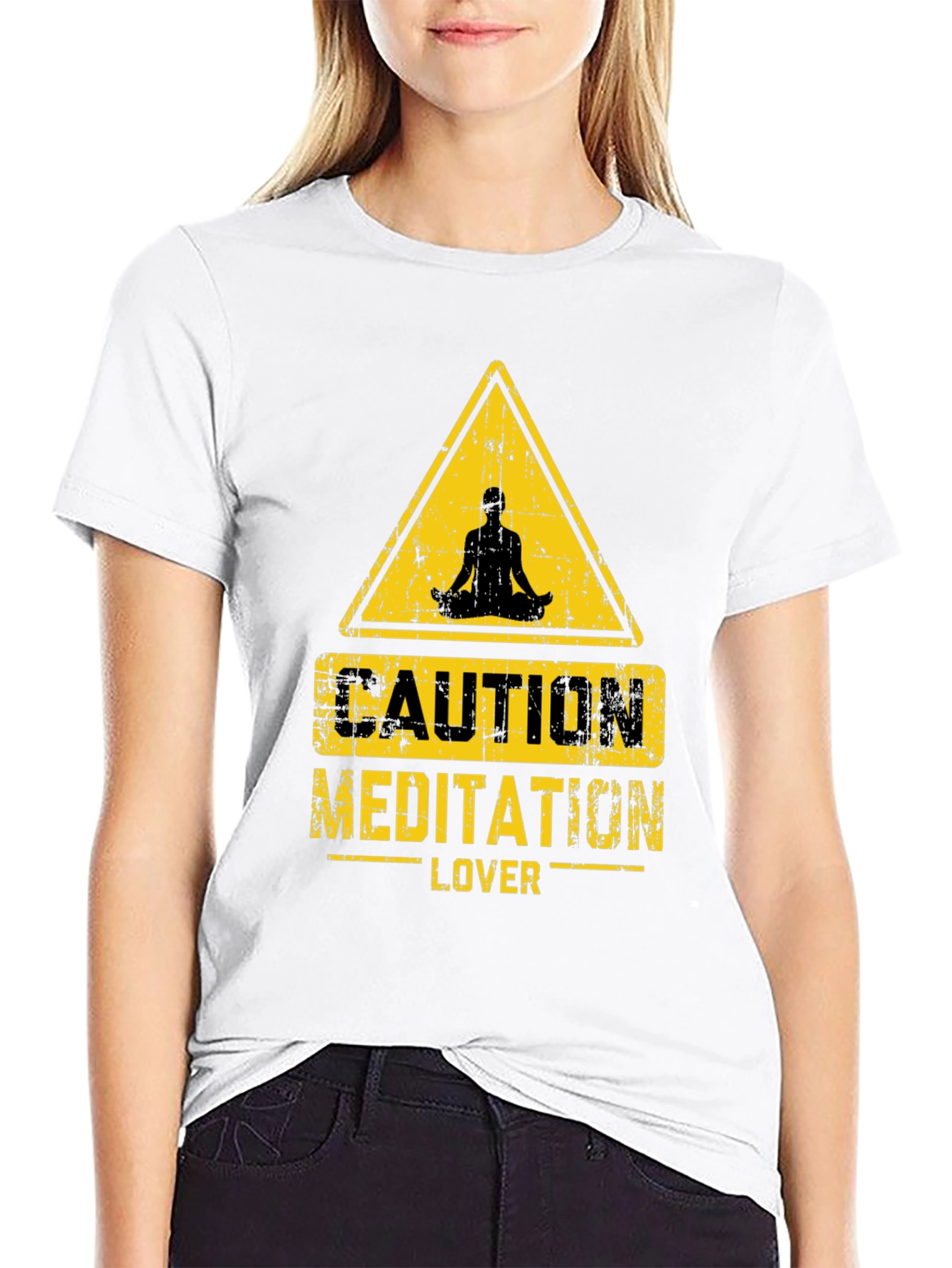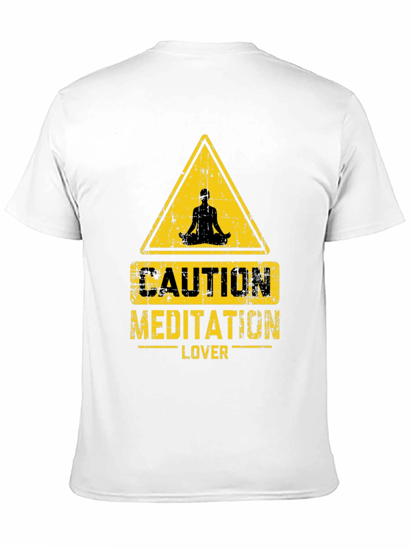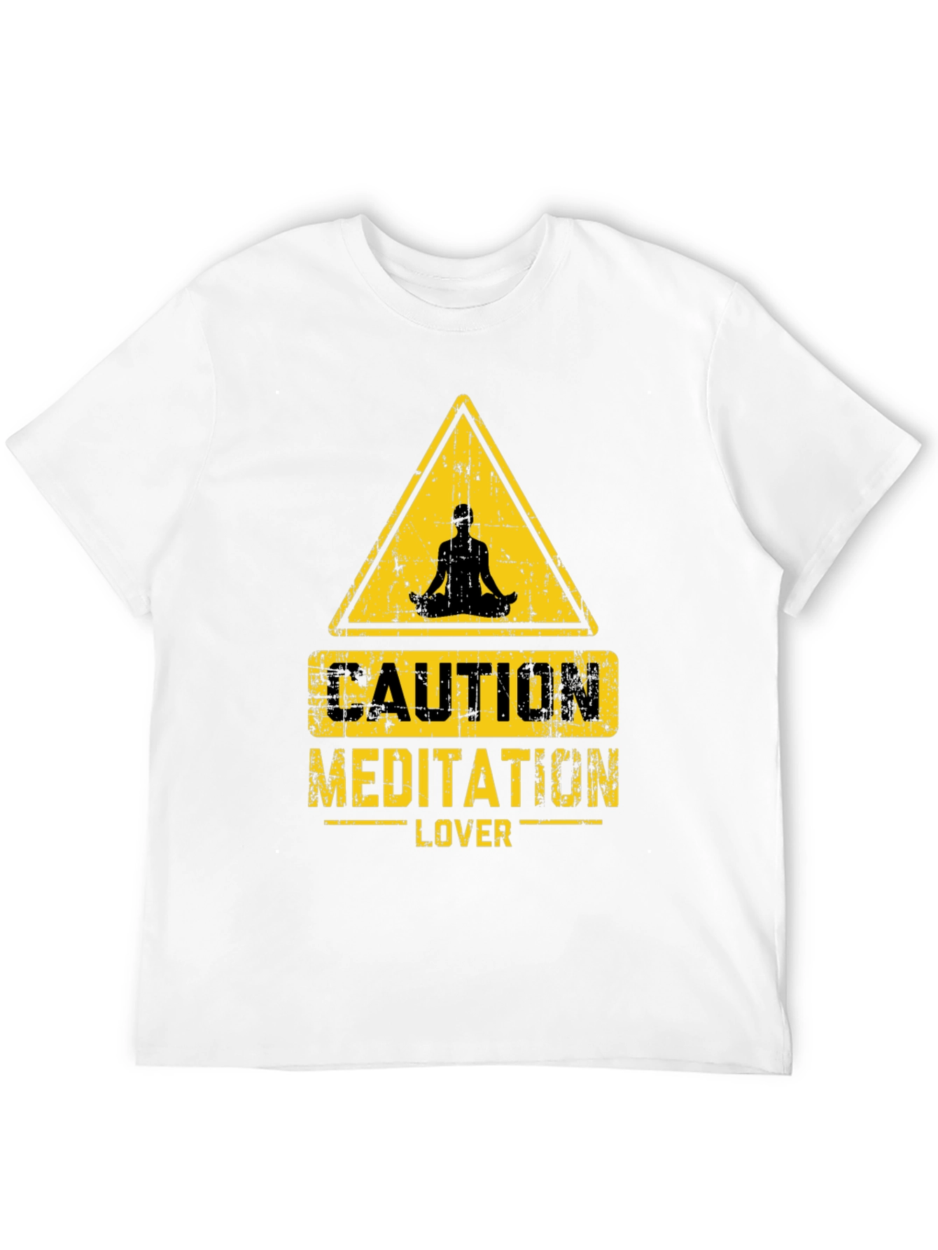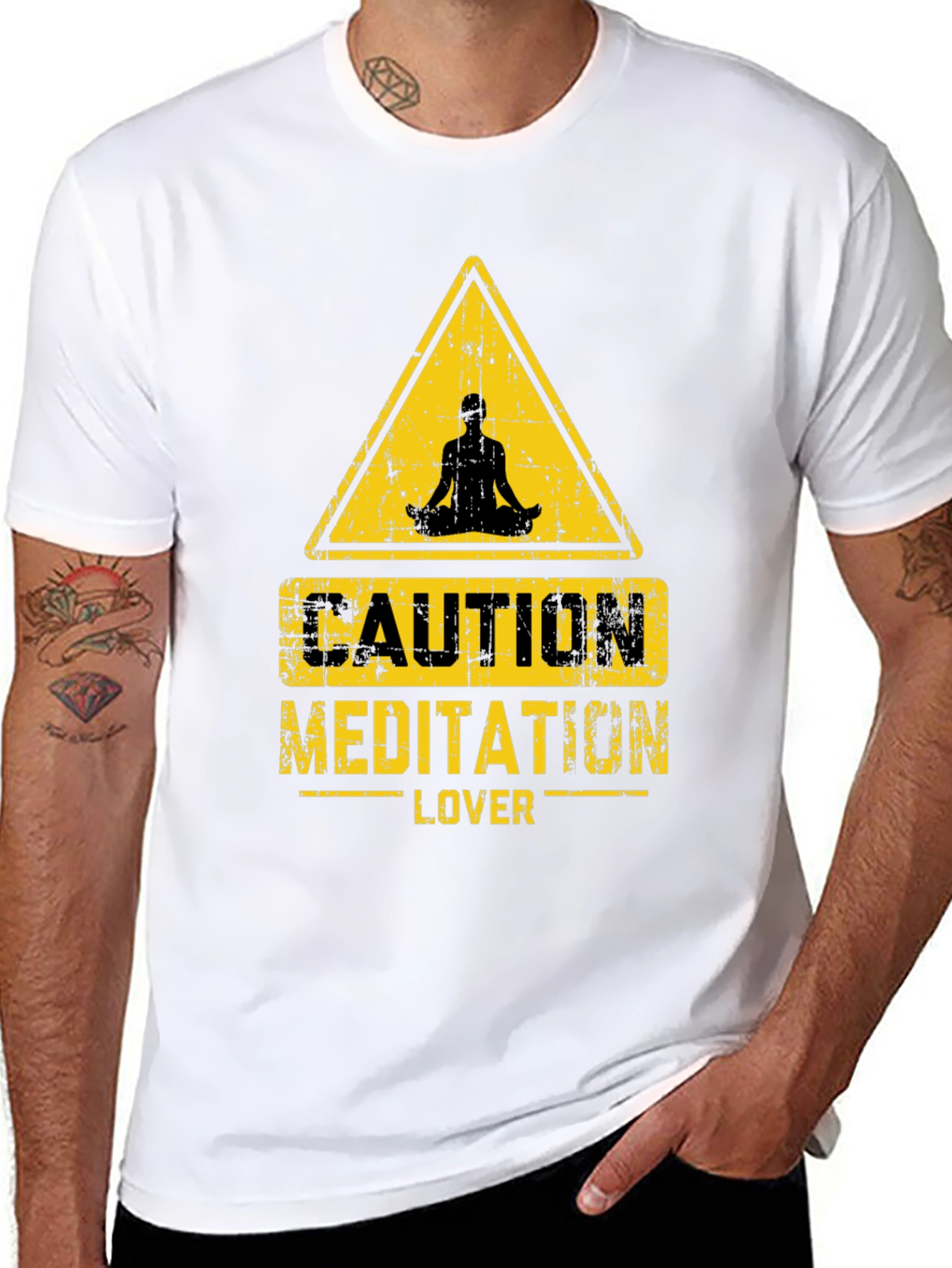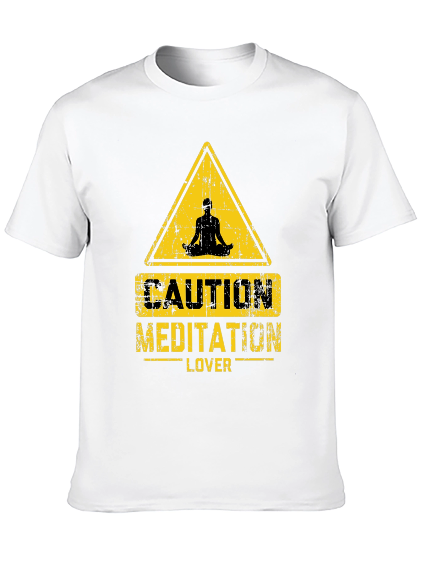 This eye-catching black t-shirt features a unique "Caution Meditation Lover" graphic design. A yellow caution sign showcases a meditating figure, drawing attention to the wearer's passion for mindfulness. The distressed text adds a vintage, edgy touch. Made from a soft, breathable fabric, this shirt is perfect for casual wear, yoga sessions, or simply expressing your love for meditation. It's an ideal conversation starter and a great gift for meditation enthusiasts. Show off your inner peace with this stylish and comfortable tee.