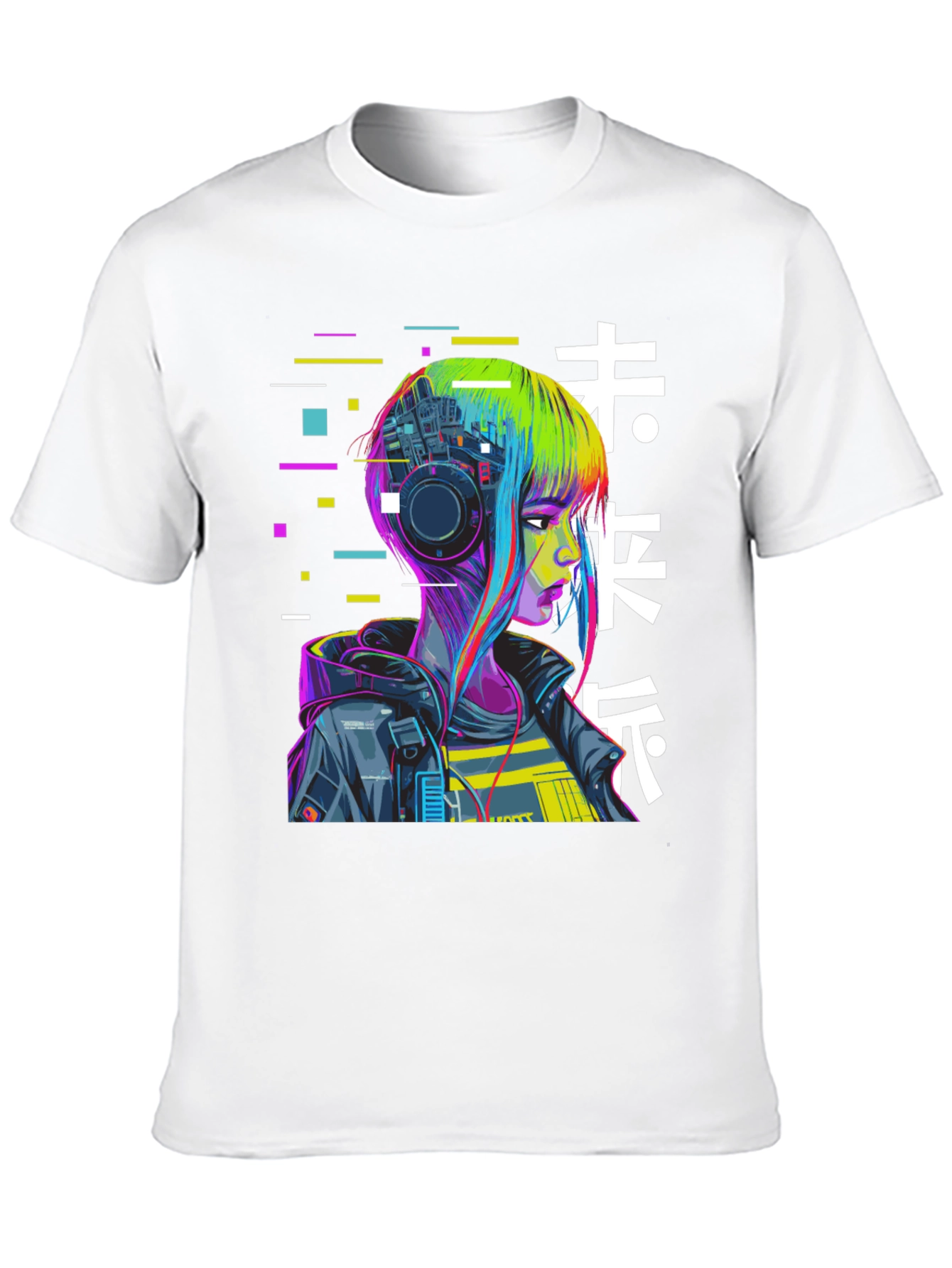 Immerse yourself in the neon-lit world with this unique graphic T-shirt. Featuring a futuristic cyberpunk-style illustration of a girl with vibrant, multi-colored hair, and headphones, intertwined with digital elements and abstract Japanese characters, this shirt is a bold statement piece. The design is printed on a soft, comfortable black fabric, perfect for everyday wear. Ideal for fans of cyberpunk, anime, or anyone looking to add a touch of edgy style to their wardrobe. This t-shirt is sure to turn heads and spark conversations. Get yours today and embrace the future!