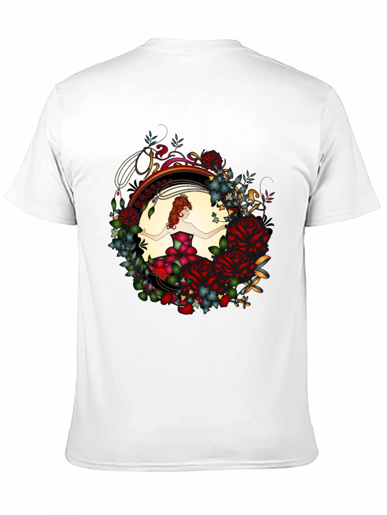 This black T-shirt features a captivating graphic design. The design showcases a woman in a dress surrounded by roses and leaves, set within a circular frame. The shirt offers a comfortable fit, perfect for casual wear. The floral theme adds a touch of elegance, making it suitable for various occasions. The bold graphic print creates a stylish look, appealing to those who appreciate unique designs. Wear it to express your style, or give it as a gift!
