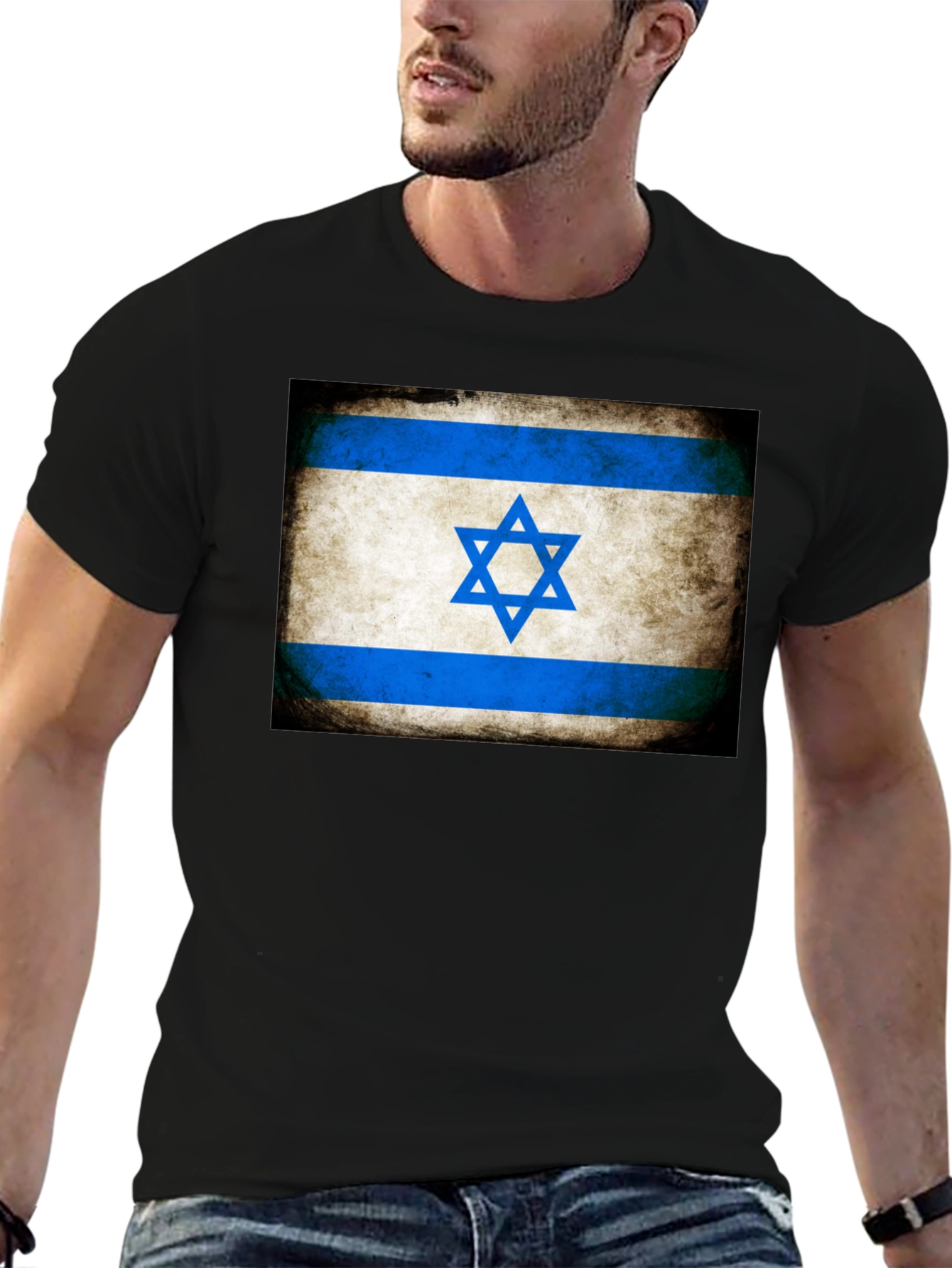 Showcase your connection to Israel with this bold, black t-shirt. Featuring a distressed-style rendition of the Israeli flag, the design is sure to turn heads. The vivid blue Star of David and stripes stand out against the slightly faded white backdrop, giving it a vintage feel. The t-shirt is made from what looks like comfortable and durable material, perfect for everyday wear or special events. Wear your pride with this unique and eye-catching shirt that is suitable for casual outings, cultural events, or as a statement piece.