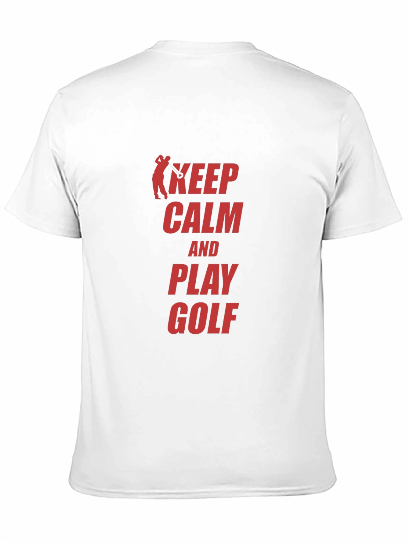 Showcase your love for the game with this stylish black t-shirt. Made from a soft, breathable fabric, this tee features a bold red graphic that reads "Keep Calm and Play Golf," accompanied by a silhouette of a golfer. The classic fit makes it comfortable for everyday wear, whether you're on the course, relaxing at home, or hanging out with friends. Make a statement on and off the green with this eye-catching golf-themed tee. Perfect for golfers and fans of the sport!