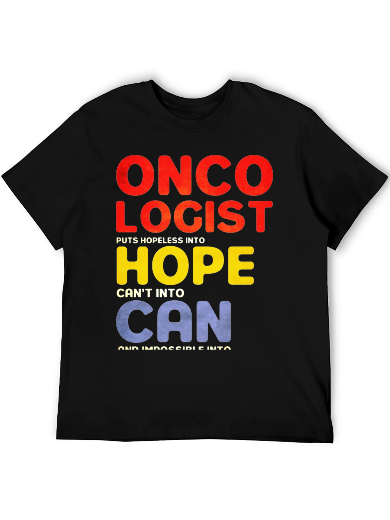Show your support with this black t-shirt featuring a clever design. Bold text reads 'ONCOLOGIST' in red, followed by 'PUTS HOPELESS INTO HOPE' in yellow, 'CAN'T INTO CAN' in blue, and 'AND IMPOSSIBLE INTO I'M POSSIBLE' in white. This shirt is perfect for oncologists, cancer survivors, or anyone who wants to spread a message of hope and resilience. It's a stylish way to raise awareness and show solidarity. Comfortable and eye-catching, wear it to support cancer research, awareness walks, or as an everyday reminder of strength and positivity. A great gift idea for doctors, nurses, and caregivers dedicated to fighting cancer. The image features the shirt being worn, giving you an accurate impression of fit.