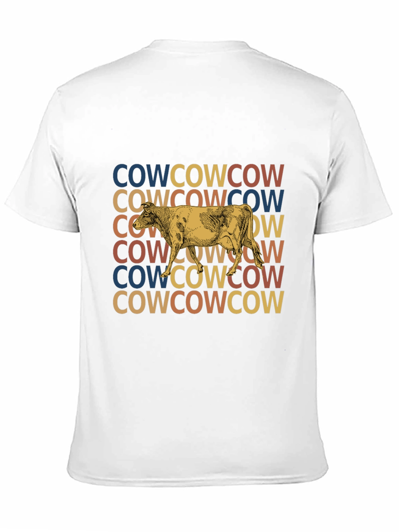 Embrace vintage vibes with this eye-catching tee! The black shirt features a retro-inspired graphic of a cow repeated with the word "COW" in alternating vintage colors: blue, tan, and reddish-brown. The design gives off a fun and playful feel. It’s made from comfortable materials, perfect for casual wear or as a statement piece in your everyday wardrobe. Wear it to a casual gathering, a picnic, or even while running errands. This shirt is a must-have for animal lovers and anyone who appreciates unique, vintage-inspired style.