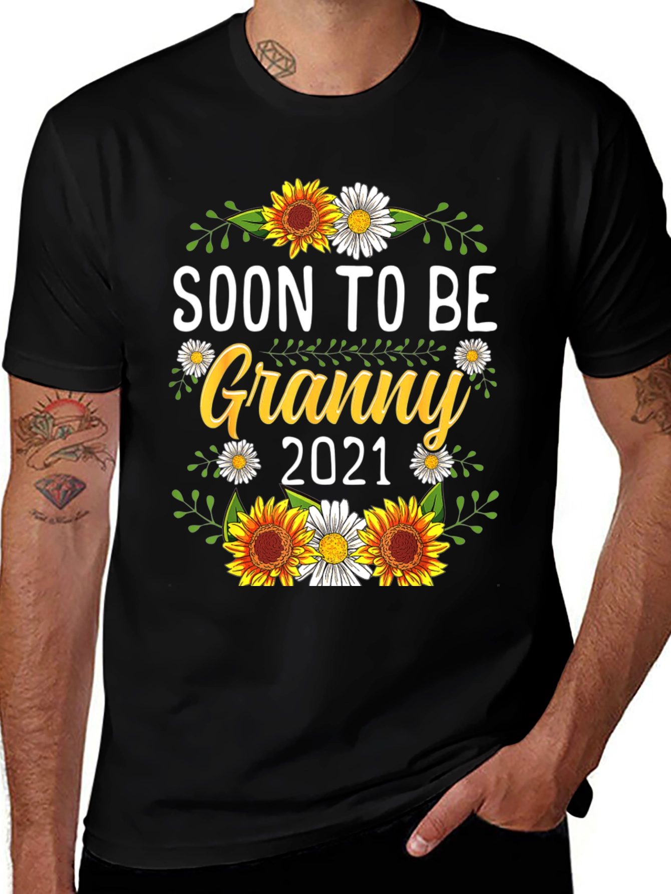 Celebrate the exciting journey to grandparenthood with this charming 'Soon to Be Granny 2021' T-shirt! This black tee features a delightful design incorporating sunflowers, daisies, and decorative leaves, creating a warm and inviting aesthetic. The phrase 'Soon To Be' sits atop the word 'Granny,' which is styled in a playful yellow cursive font. '2021' is prominently displayed below. Made from a comfortable fabric, this shirt is perfect for expecting grandmothers to wear during pregnancy announcements, baby showers, or simply as a joyful expression of their new role. It makes a thoughtful and heartwarming gift for the soon-to-be grandmother in your life.