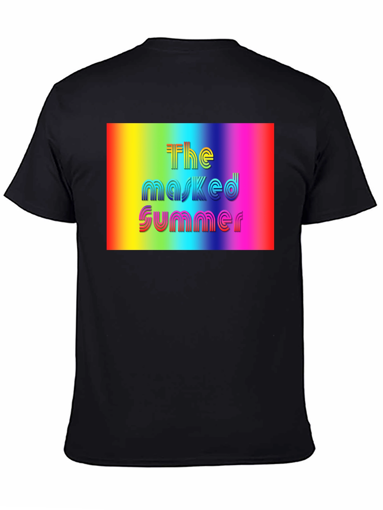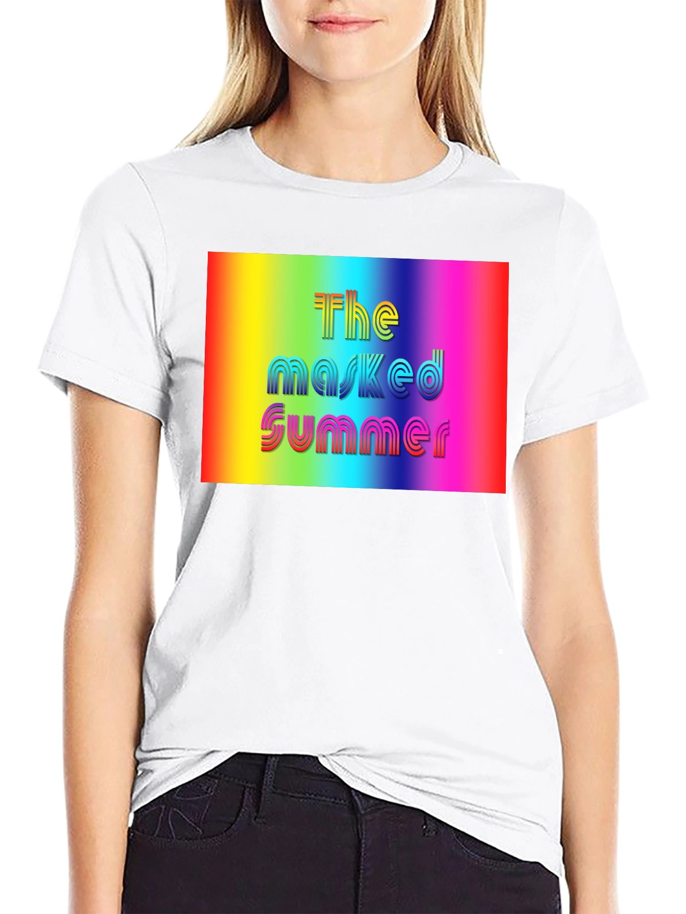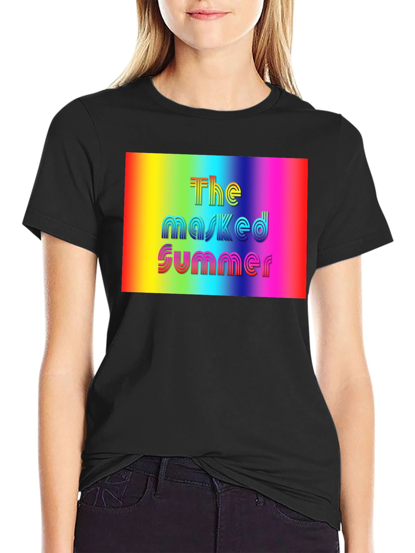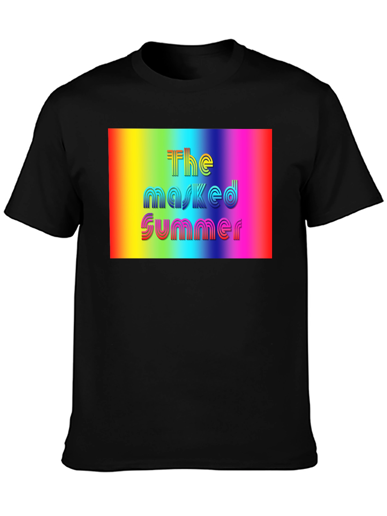 Express your vibrant style with this eye-catching graphic tee. This black t-shirt features a bold, colorful design with "The Masked Summer" text in a retro-inspired font against a rainbow background. The vivid colors and unique design make this tee a standout piece for casual wear. Made from a soft, comfortable fabric, it's perfect for everyday activities, summer outings, or expressing your individuality. Pair it with jeans, shorts, or a skirt for a cool and trendy look. Add a pop of color and personality to your wardrobe with this must-have statement tee.