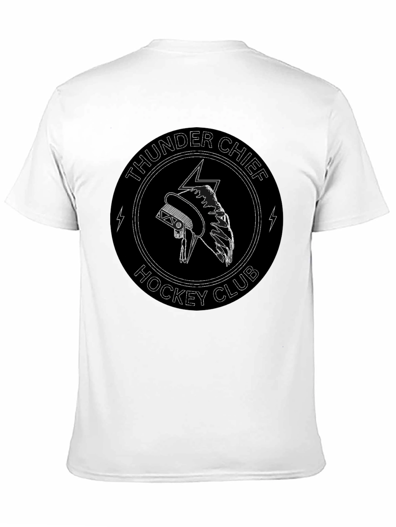 Show off your hockey spirit with this classic black t-shirt! Featuring a unique circular graphic of a Native American headdress with a lightning bolt, encircled by the words "Thunder Chief Hockey Club," this tee is perfect for players and fans alike. The crisp white design pops against the dark backdrop, making a bold statement. Made from comfortable materials, this t-shirt is ideal for everyday wear, game days, or casual outings. Support your team in style!