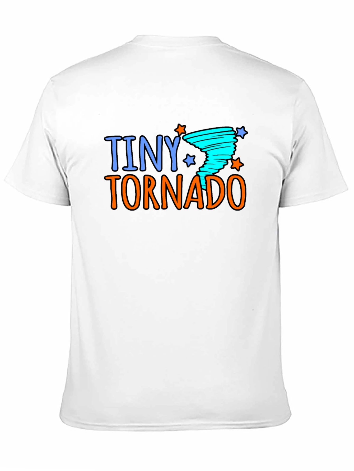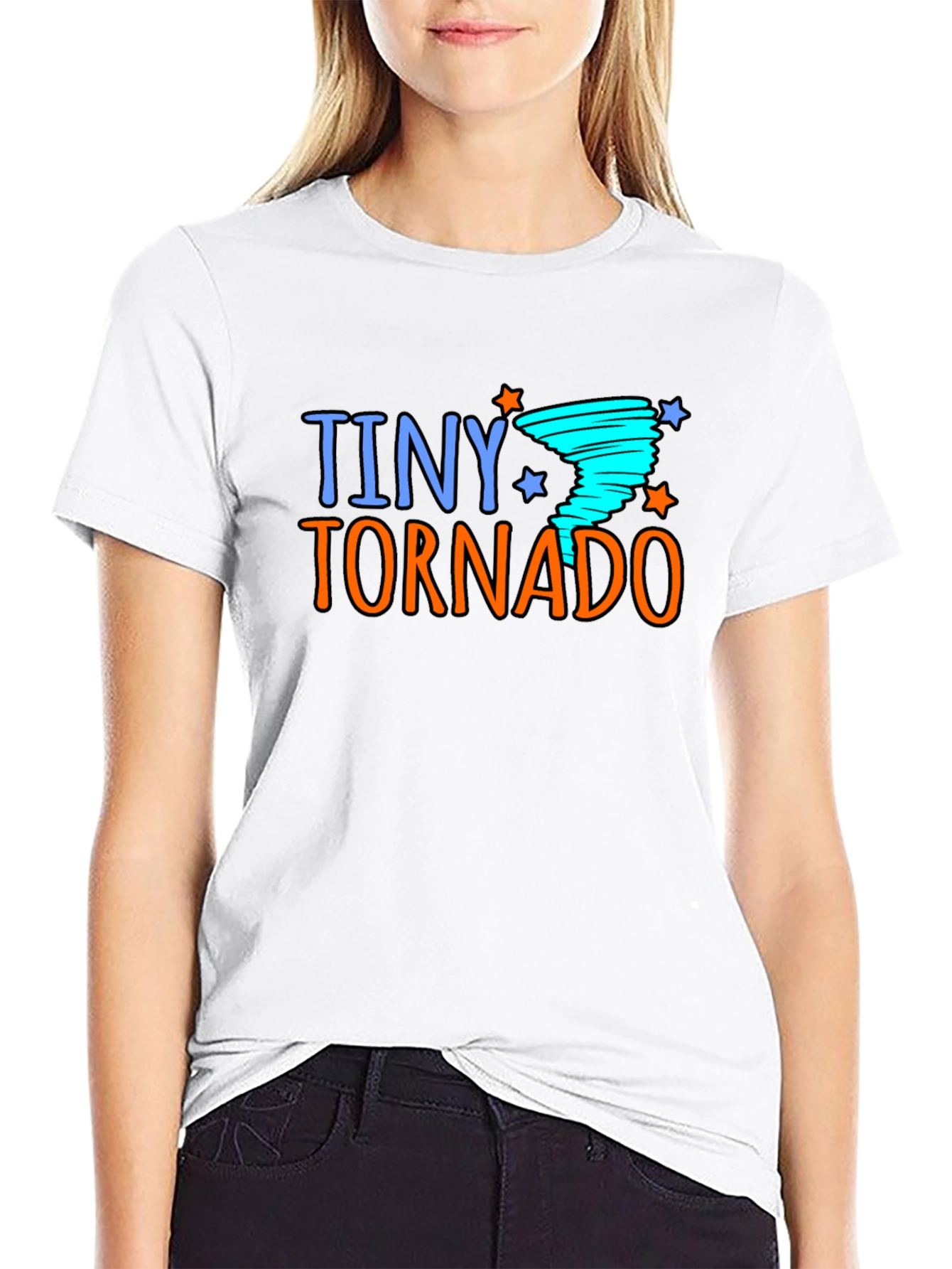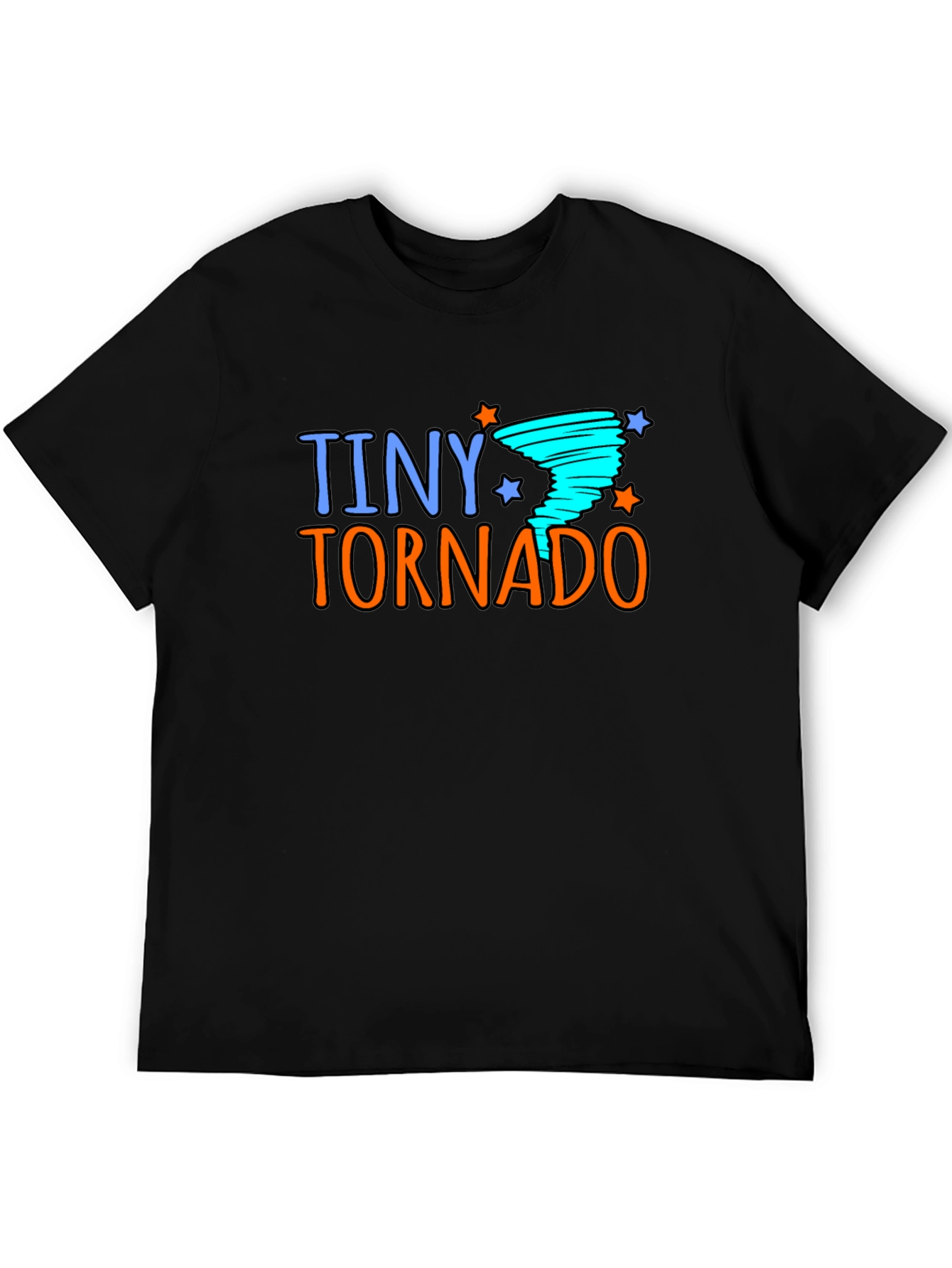 Showcase your whirlwind personality with this eye-catching Tiny Tornado graphic tee! This black, short-sleeved t-shirt features a playful design with the words "Tiny" and "Tornado" in contrasting orange and blue fonts. A stylized turquoise tornado graphic adds a fun, whimsical touch. Made from a comfortable-looking fabric, this tee is perfect for casual wear, expressing your vibrant energy, or making a statement wherever you go. Pair it with jeans, shorts, or a skirt for a stylish and comfortable look. Embrace your inner tiny tornado with this unique t-shirt!