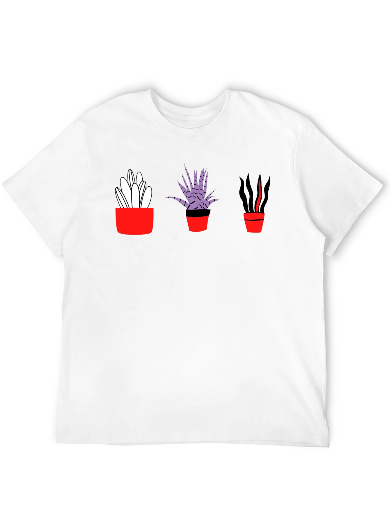 Showcase your love for plants with this unique graphic t-shirt. The design features three stylized potted succulents in vibrant red pots, adding a pop of color to the classic black backdrop. Made from a comfortable fabric, this tee offers both style and comfort for everyday wear. Perfect for casual outings, gardening enthusiasts, or anyone who appreciates minimalist design, this shirt is a versatile addition to your wardrobe. Pair it with jeans or shorts for a relaxed look, or dress it up with a blazer for a more polished ensemble. Available in various sizes.